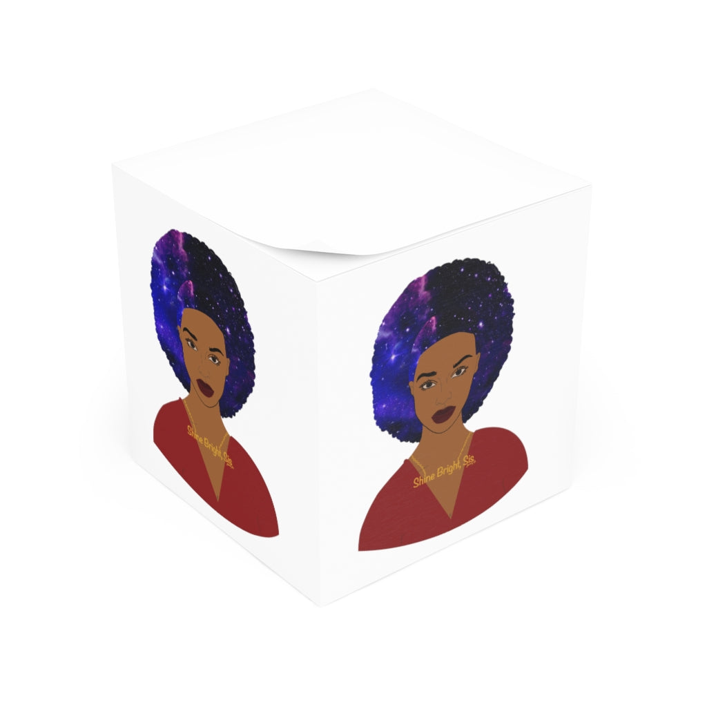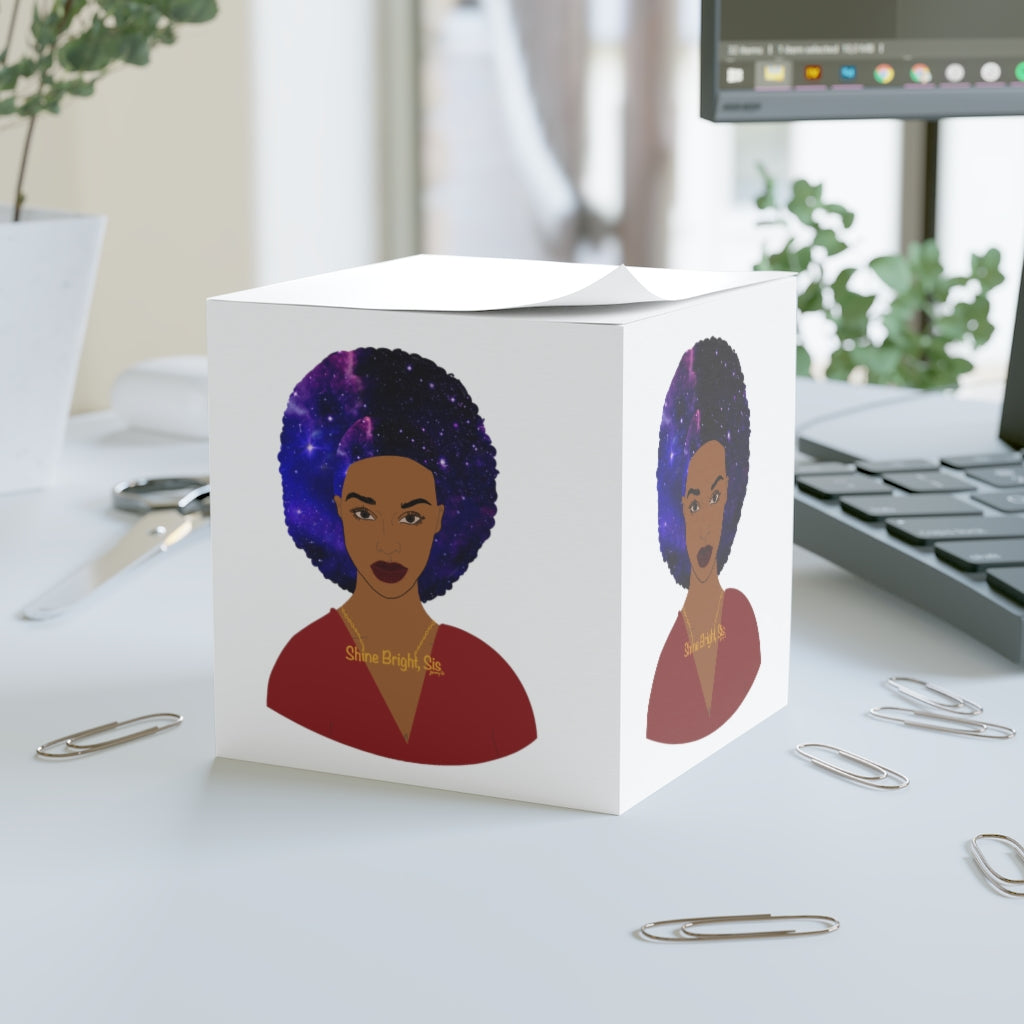 When utility meets clever design, the GIANT sticky note cube is born. This HUGE sticky note cube features 700 sticky sheets for you to conveniently take notes on. Features my original black girl magic art around the edges, (STICKY NOTE SHEETS ARE WHITE AND DO NOT INCLUDE THE IMAGE. THE IMAGE IS ON THE SIDE OF THE CUBE ONLY). This note cube looks right at home on any desk or office space. Each cube measures 3.37" (W) by 3.5" (H).